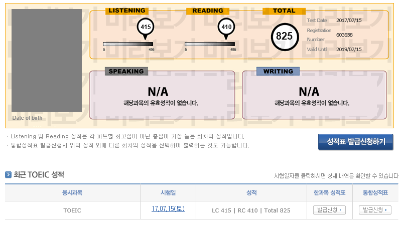 ¼ö¾÷À» ¼ö°ÇÏ´ø Áß 2ÁÖ Â÷¿¡ Á¤±âÅäÀÍ¿¡ ÀÀ½ÃÇÏ¿© 825Á¡À̶ó´Â Á¡¼ö¸¦ ¾òÀ» ¼ö ÀÖ¾ú½À´Ï´Ù.