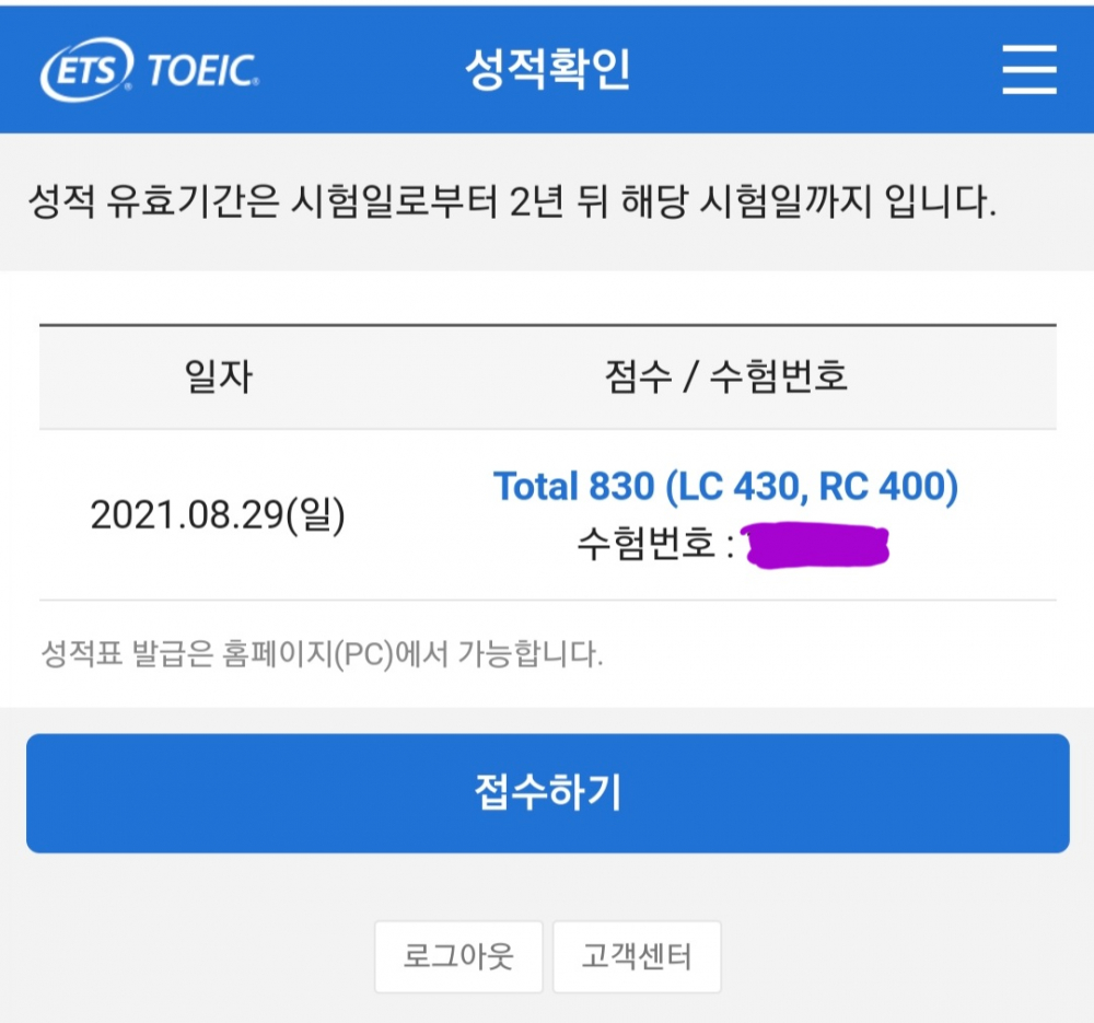 óÀ½ º» ÅäÀÍ ½ÃÇè¿¡¼ 830Á¡À̶ó´Â ±â´ë ÀÌ»óÀÇ °á°ú°¡ ³ª¿Ô½À´Ï´Ù!!