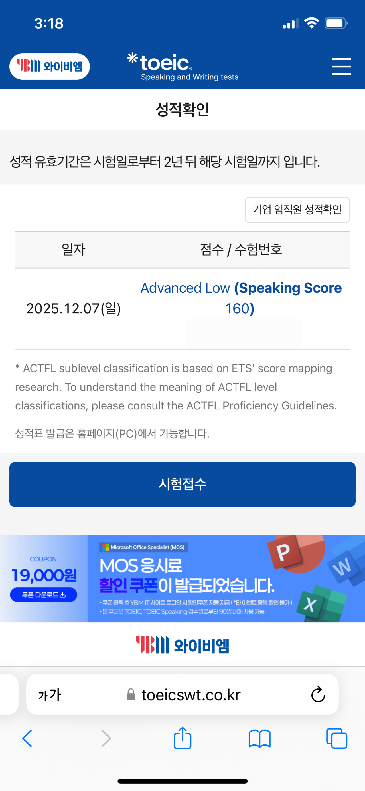 시험 끝나고는 망했다가 가장 먼저 든 생각이긴 했습니다. 여전히 답변 시간이 부족했고 대답은 다 했지만, 첫 시험이라 긴장을 많이 했어서 답변하는 내내 제가 무슨 말을 하고 있는지 모르겠는 상태로 시험을 봤습니다. 특히 마지막 문제는 예시를 들다 멍해져서 마무리를 못지었습니다. IH라도 나오라고 점수 나오는 날까지 빌었는데 다행히 AL이 나와서 원큐에 끝낼 수 있게 되었습니다.